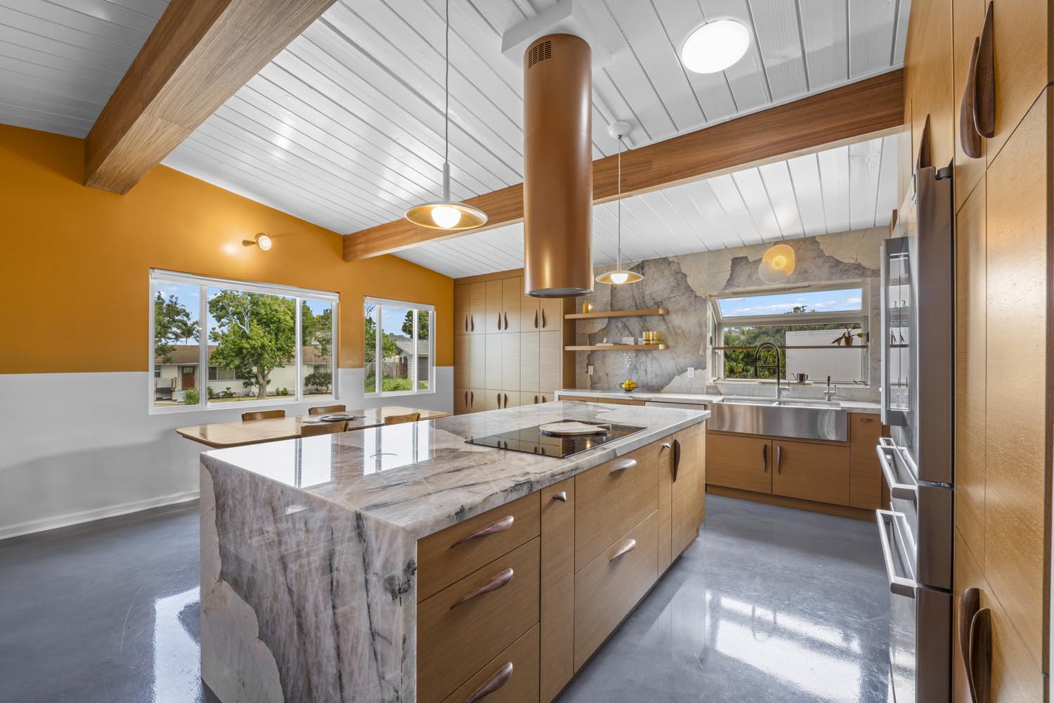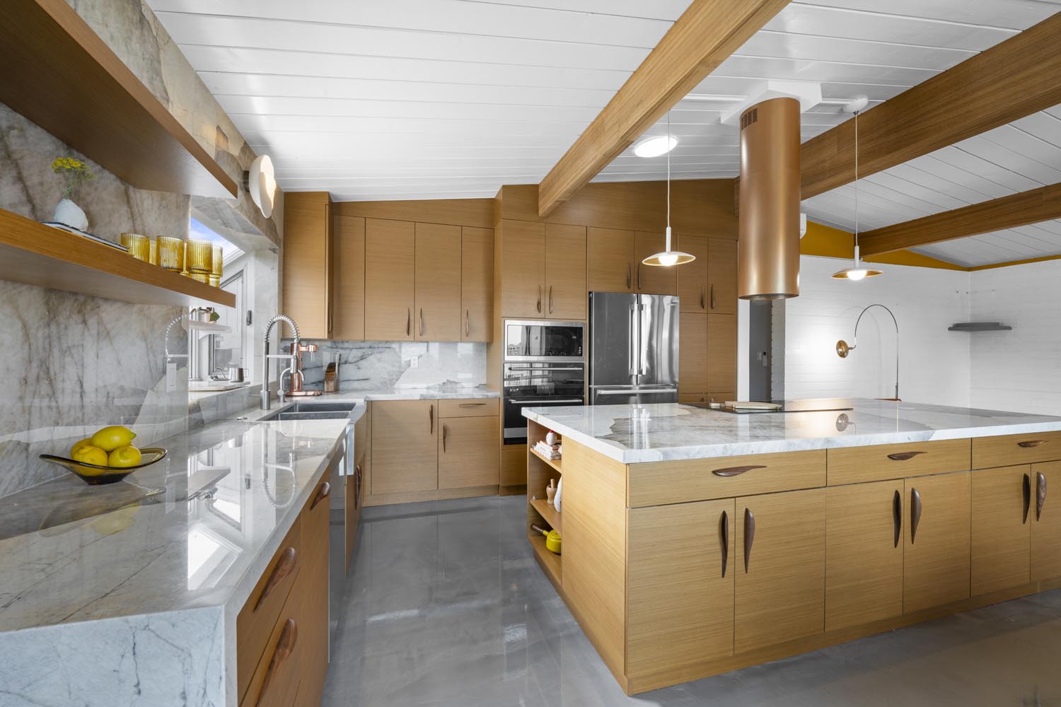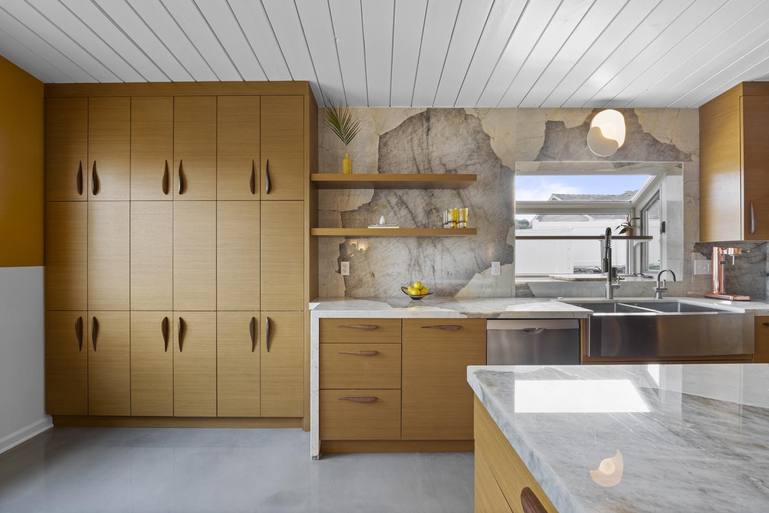 This cozy bay view home with vaulted wood ceilings was the perfect space for this elegant kitchen design. The project began by removing the interior wall and adding more windows on the Bayside wall to really open up the space and capture views of SD Bay and bridge below Next, teak cabinets were installed and fitted to the ceiling slope. Quartzite countertops with matching full height backsplash top off the matching base cabinets. The ceiling beams were then veneered with teak to match the cabinets. An epoxy floor rounds up the project and adds to it’s signature look