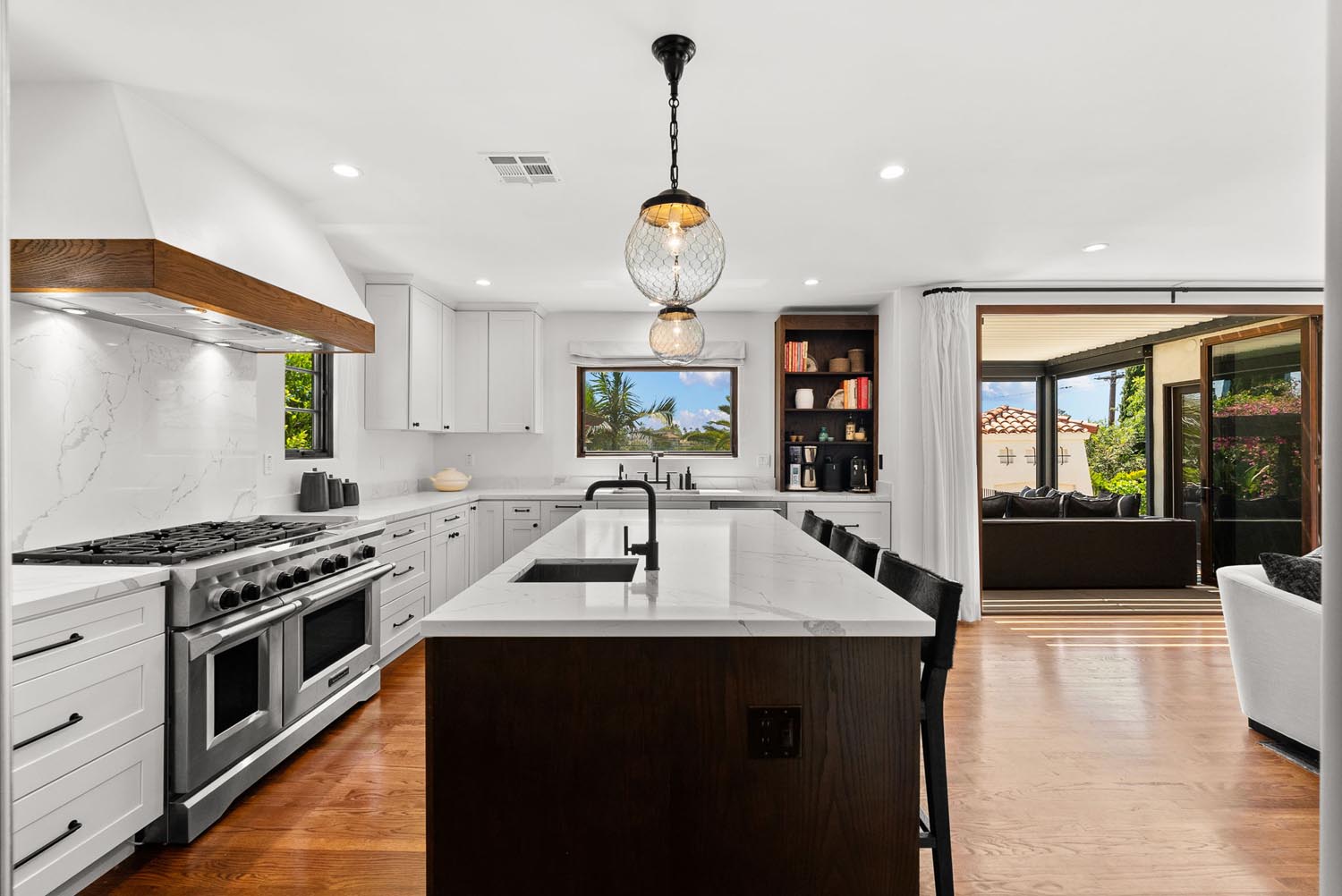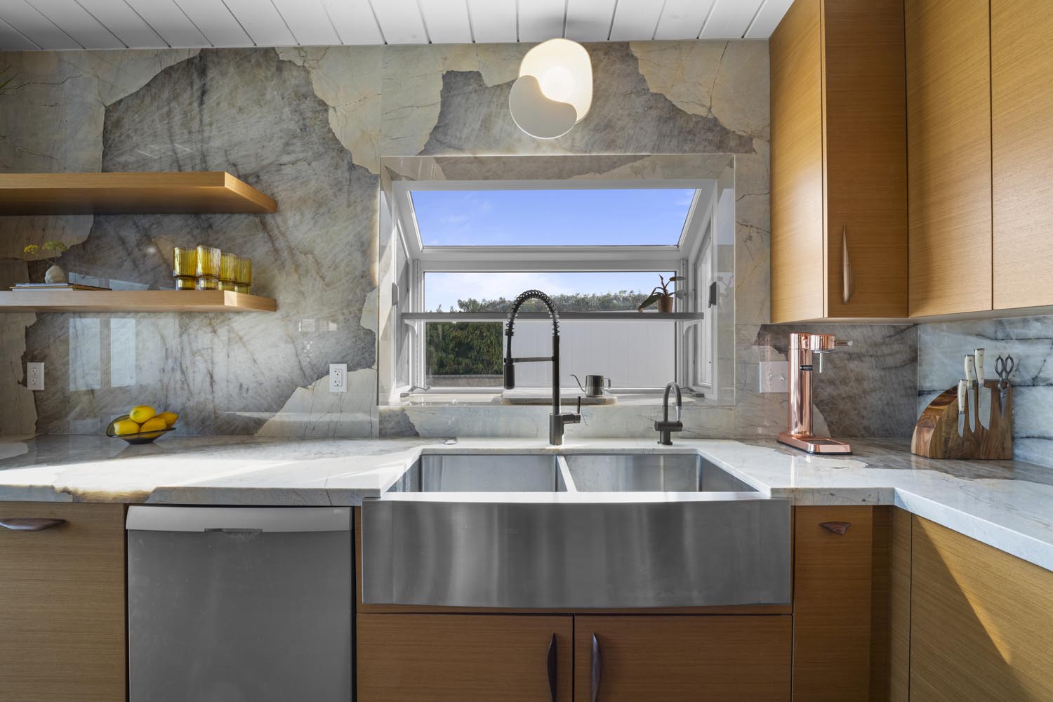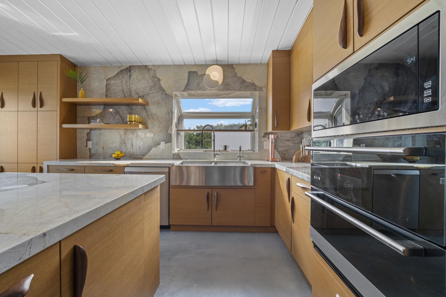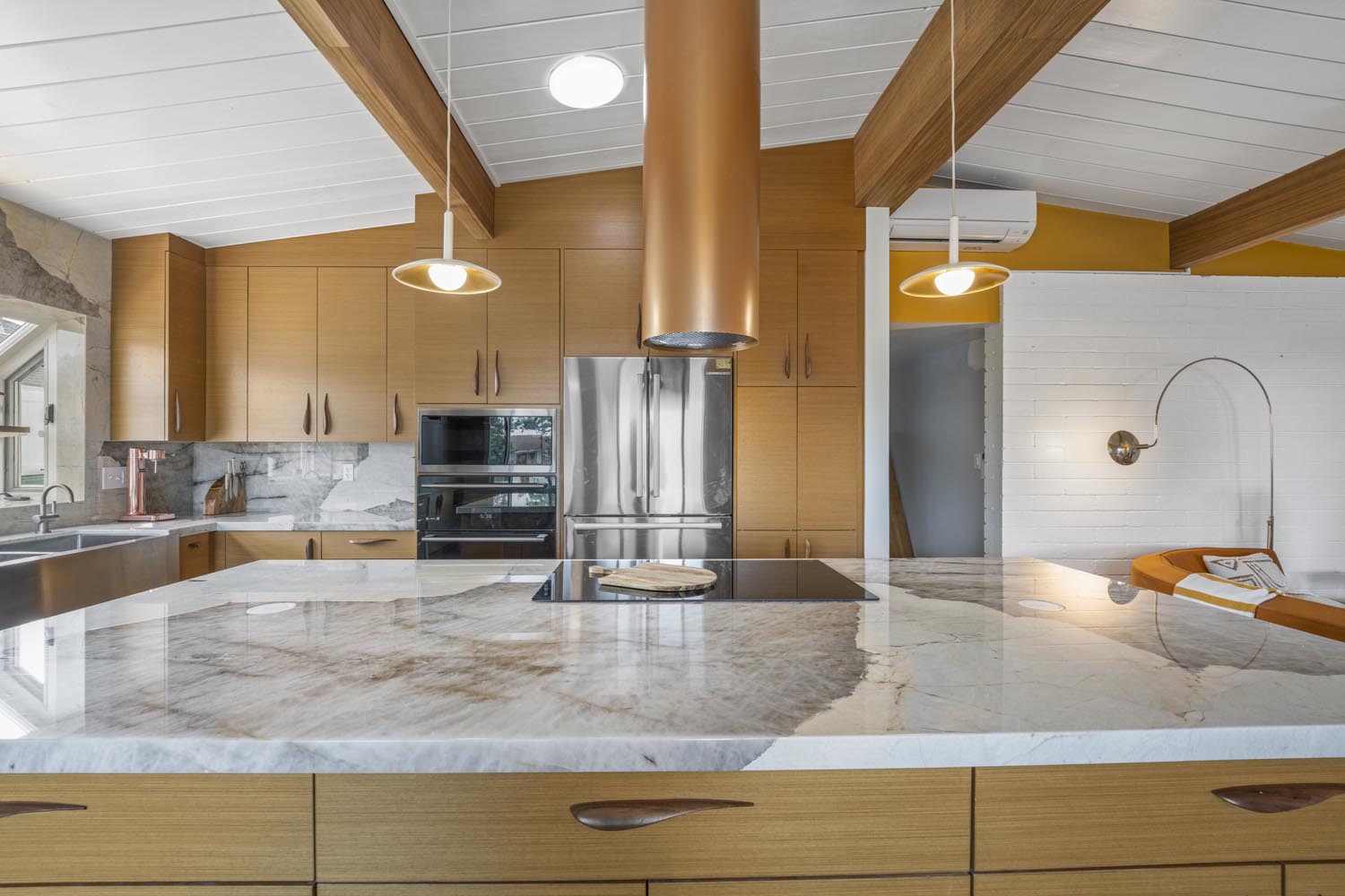 This cozy bay view home with vaulted wood ceilings was the perfect space for this elegant kitchen design. The project began by removing the interior wall and adding more windows on the Bayside wall to really open up the space and capture views of SD Bay and bridge below Next, teak cabinets were installed and fitted to the ceiling slope. Quartzite countertops with matching full height backsplash top off the matching base cabinets. The ceiling beams were then veneered with teak to match the cabinets. An epoxy floor rounds up the project and adds to it’s signature look