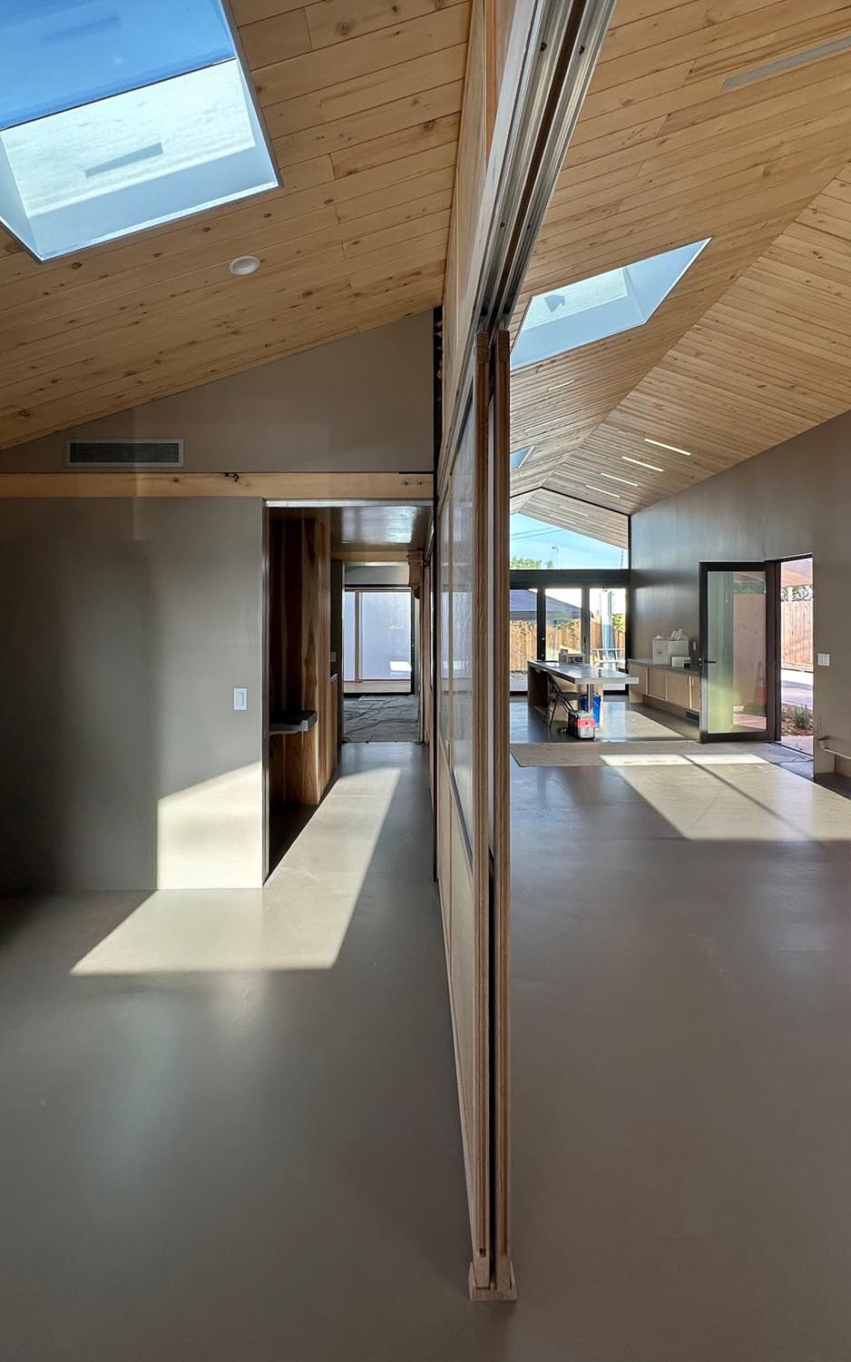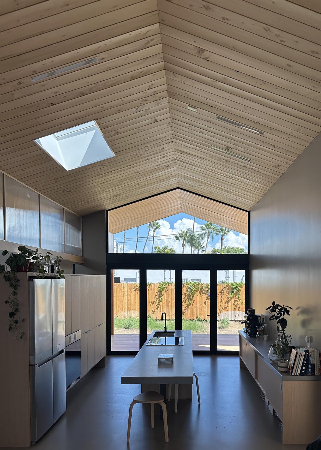 About 1,044 square feet was reimagined, plus a 100 SF addition to increase comfort. Shoji-inspired polycarbonate panels, skylights, and expansive Western Window Systems doors flood the space with light. Native, drought-tolerant plants attract butterflies and birds, embodying a new approach to design-forward, indoor-outdoor living.